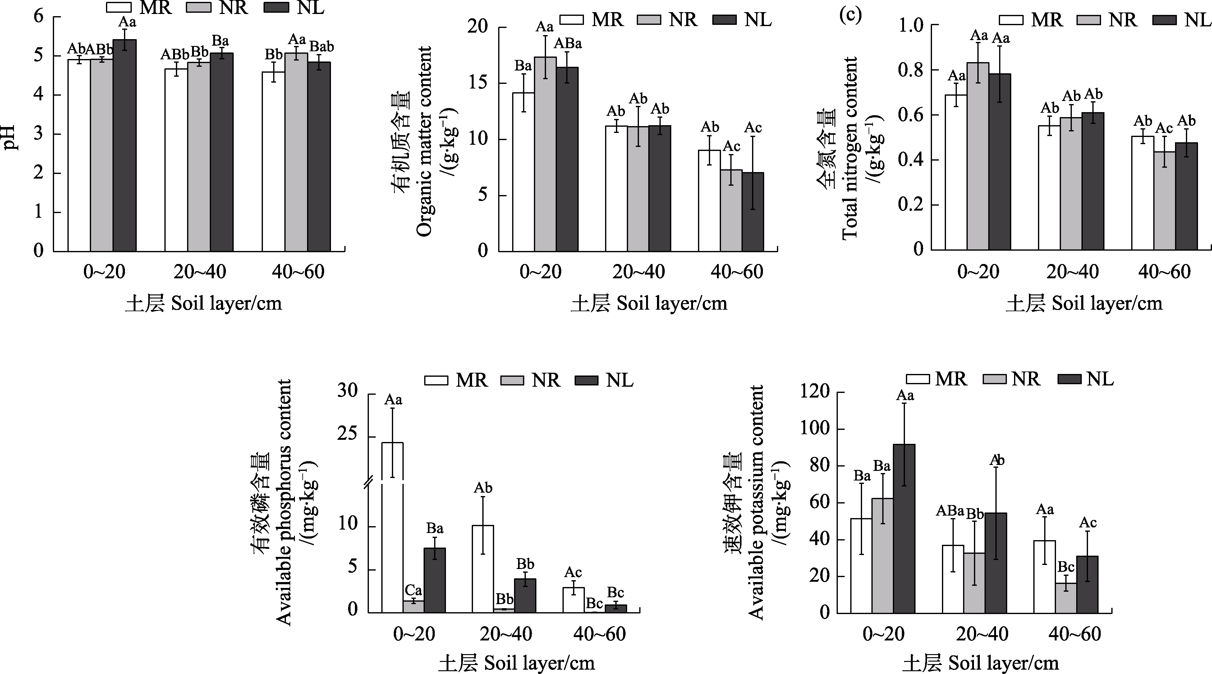 不同土地利用方式下土壤pH、有机质、全氮、有效磷、速效钾含量
