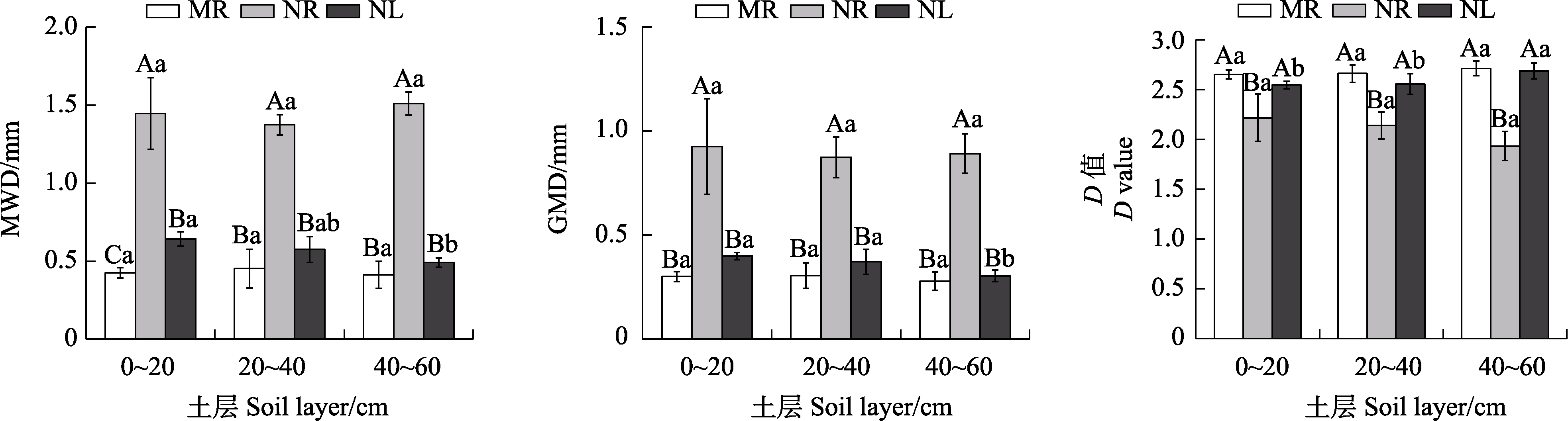 不同土地利用方式下土壤水稳性团聚体的MWD、GMD和D值