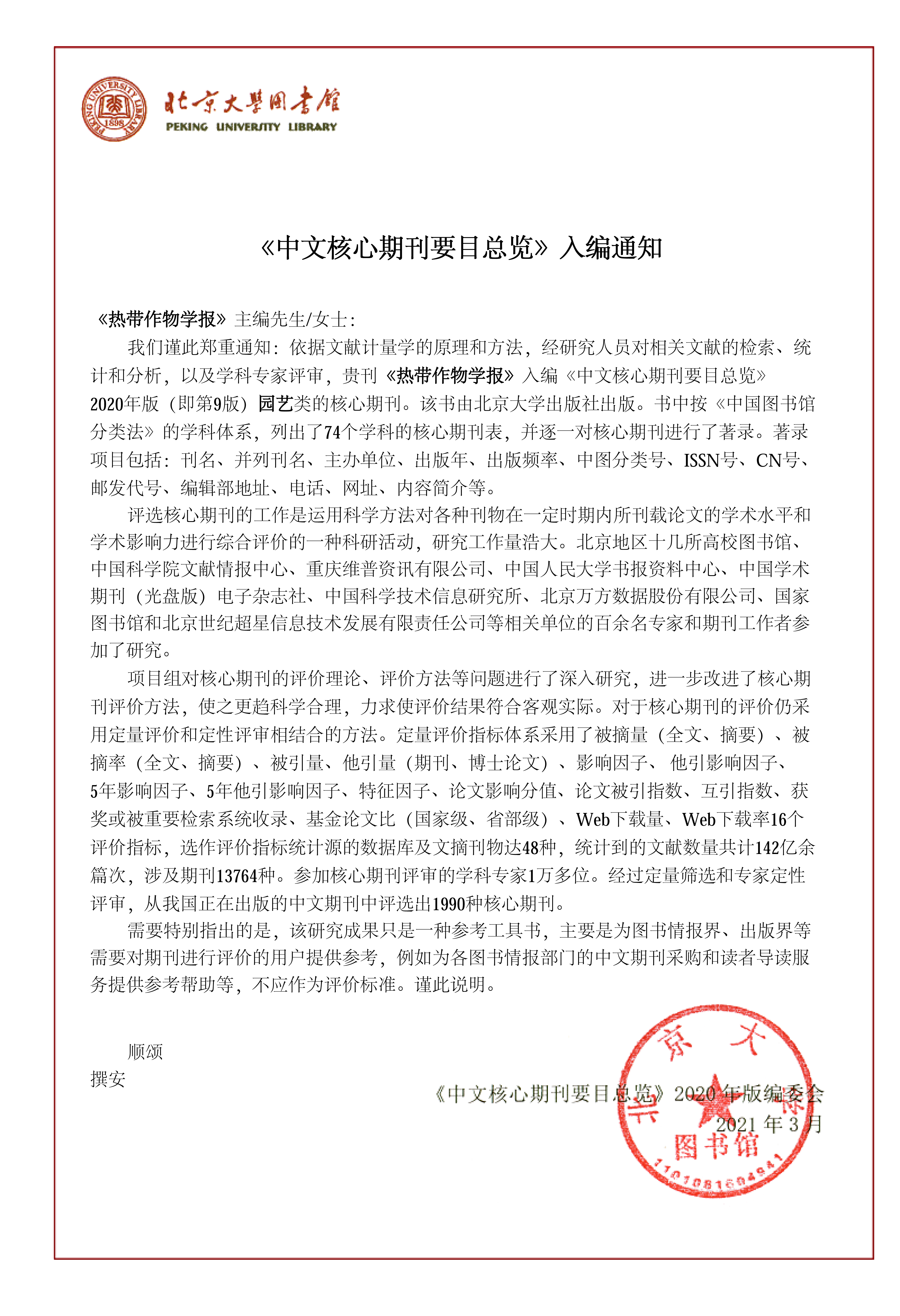近日,《热带作物学报》入编北京大学图书馆《中文核心期刊要目总览》2020年版(即第9版),这是《热带作物学报》自2011年以来连续4次入编《中文核心期刊要目总览》。